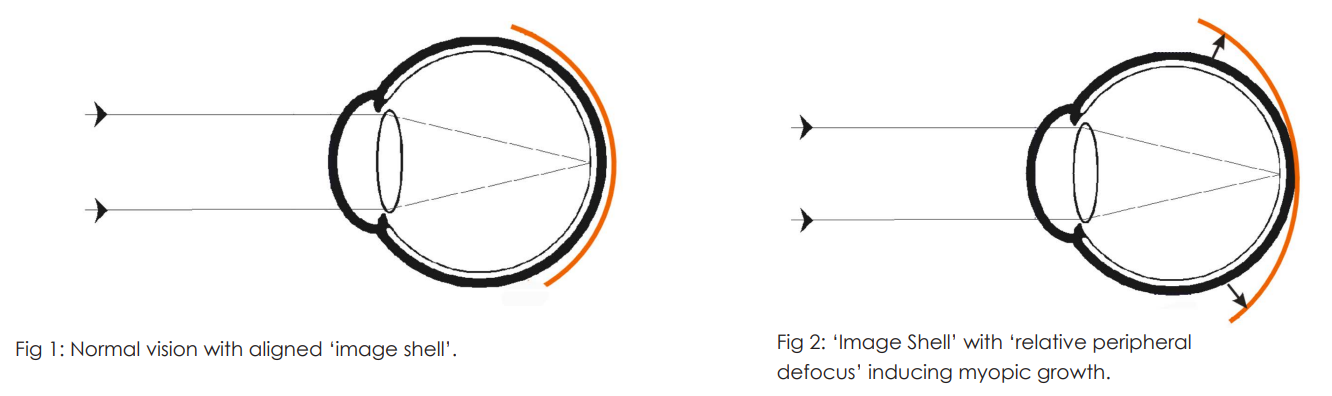 Figure 2: A push toward short sight is induced when the ‘image shell’ is behind the retina in the periphery (Fig 2). The patient will not notice this as the central vision is clear. The ‘peripheral defocus’ stimulates the eye to grow in an attempt to bring this imaging into focus.